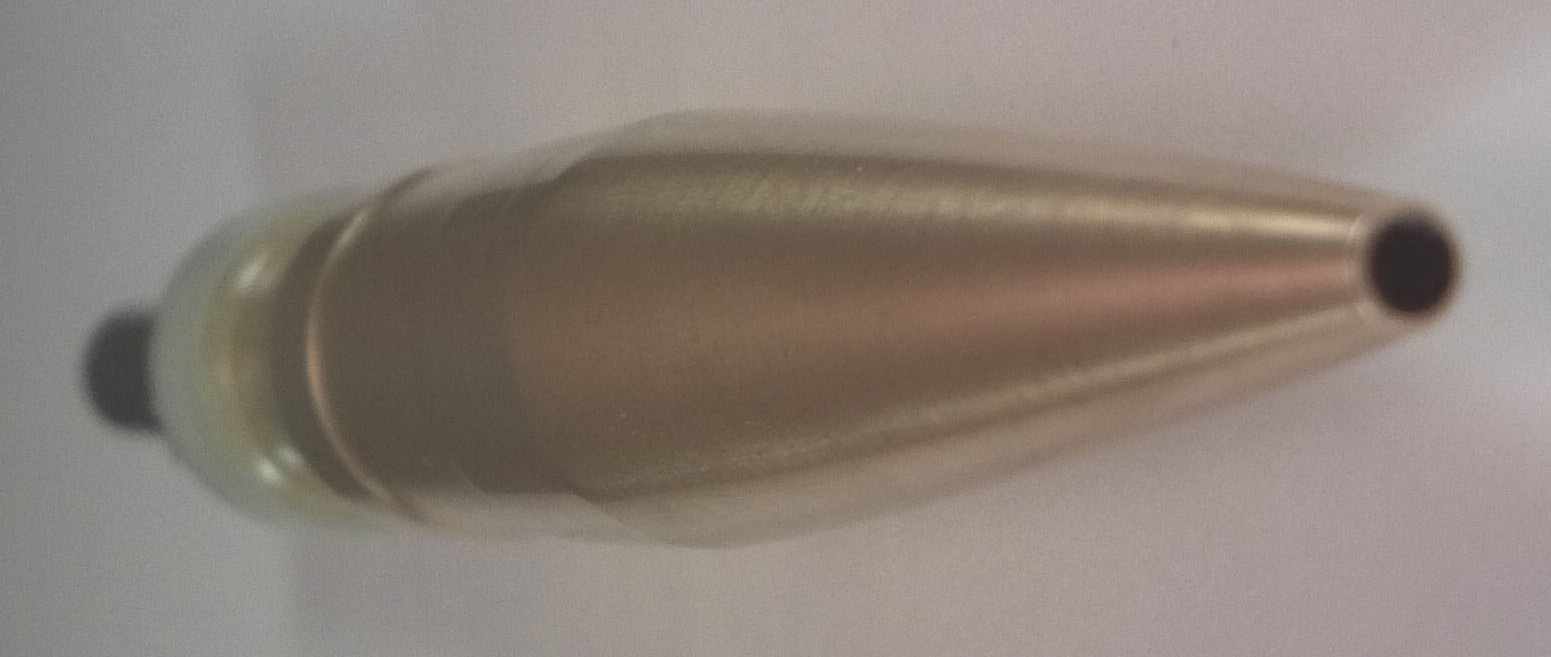 It uses the standard .50 BMG once-fired cartridge for the base of the pen. The pen tip is milled from a real 800 grain solid brass boattail bullet that we order from reloading suppliers. The tip of the bullet is blunted to allow for drilling, then a 5/64th inch hole is carefully drilled through the tip to allow the pen cartridge to extend and retract.
