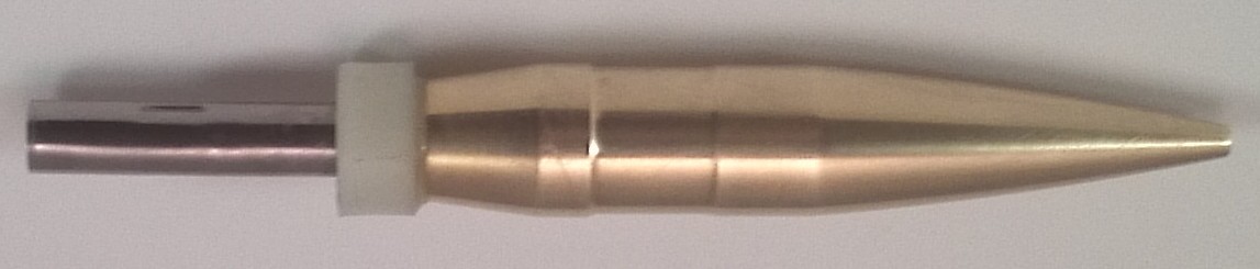 It uses the standard .50 BMG once-fired cartridge for the base of the pen. The pen tip is milled from a real 800 grain solid brass boattail bullet that we order from reloading suppliers. The tip of the bullet is blunted to allow for drilling, then a 5/64th inch hole is carefully drilled through the tip to allow the pen cartridge to extend and retract.
