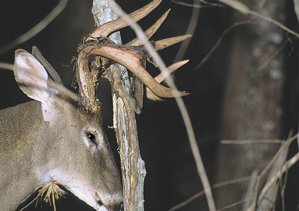 Deer scraping antlers to remove velvet
